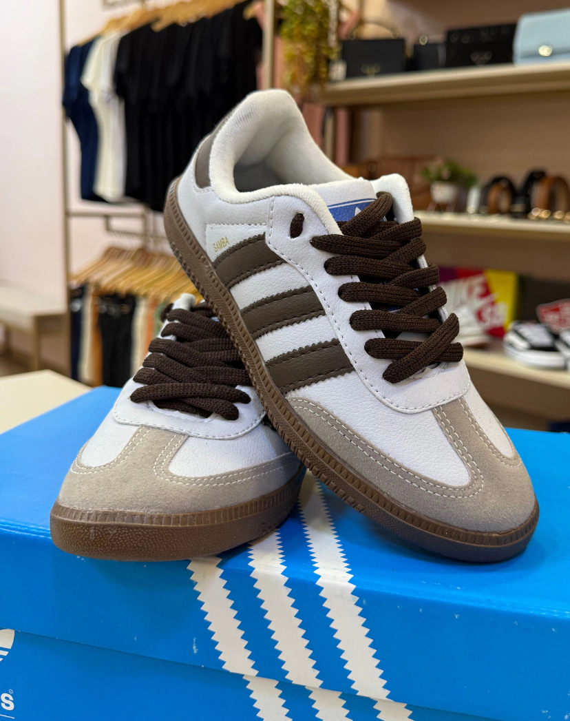 Adidas Samba - Marrom e Branco Descubra o clássico Adidas Samba em uma combinação sofisticada de marrom com detalhes em branco, ideal para quem busca estilo e conforto no dia a dia.